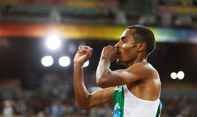 8月23日,埃塞俄比亞選手克內尼薩·貝耶查在比賽后慶祝。當日,貝耶查在北京奧運會男子5000米決賽中以12分57秒82的成績奪得金牌并打破奧運會紀錄。