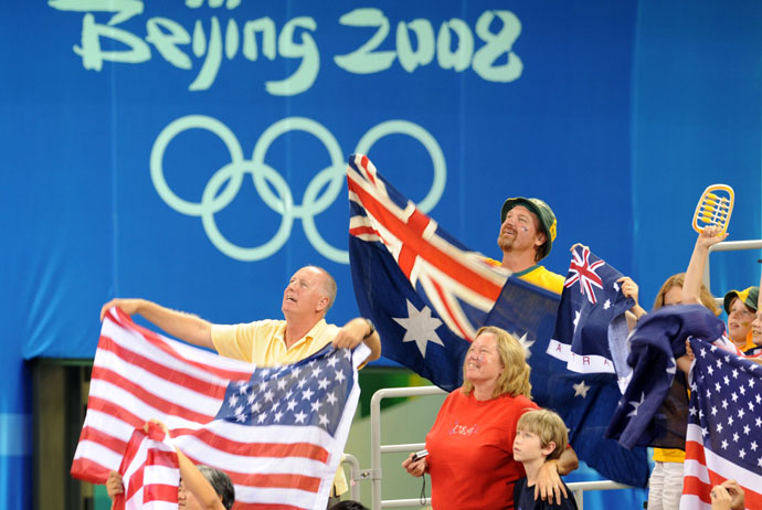 8月23日,美國隊和澳大利亞隊球迷在為各自的球隊加油助威。當日,在北京五棵松奧林匹克籃球館進行的北京奧運會女籃決賽中,美國隊以92比65戰勝澳大利亞隊,獲得冠軍。