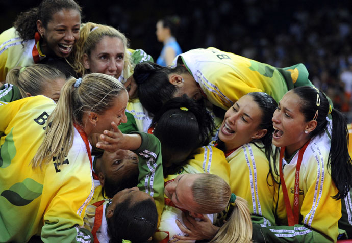 8月23日,兩名巴西隊隊員擁抱慶祝勝利。當日,在北京奧運會女排決賽中,巴西隊以3比1戰勝美國隊,獲得冠軍。