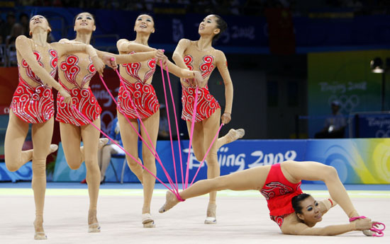 中國藝術體操新的歷史24日在北京工業大學體育館書寫。中國姑娘們在奧運會藝術體操比賽中,以35.225分歷史性地奪得集體全能銀牌,這也是中國藝術體操的首枚奧運會獎牌。 實力超群的俄羅斯隊以35.550分奪得金牌,再次包攬奧運會藝術體操兩金。白俄羅斯隊以34.900分奪得銅牌。 北京奧運會藝術體操項目設個人全能和集體全能兩枚金牌。此前,中國藝術體操的歷史最好成績是亞特蘭大奧運會的第五名。24日的決賽中,中國藝術體操姑娘們在家門口大放異彩。她們動作編排精美,整體配合默契,在首輪5繩比賽中,就奪得第三名,超過主要競爭對手意大利隊0.575分。 次輪3圈+2棒的比賽中,伴著京劇傳統音樂開場,中國姑娘們時而如飛鳥凌空展翅,時而如孔雀驚艷開屏,甜美的笑容打動了全場觀眾?胺Q完美的表現令中國隊得分超過白俄羅斯隊,一舉奪得集體全能銀牌?粗罱K的得分大屏幕,中國藝體姑娘們高興地擁抱在一起,哭成一團。她們創造了中國藝術體操新的歷史。 俄羅斯隊在決賽中再次展示了在藝術體操領域的“霸主”地位。兩輪的全場最高分讓她們再次包攬了北京奧運會藝術體操的兩枚金牌。這也是從悉尼奧運會開始,俄羅斯隊連續三屆奧運會實現個人全能和集體全能金牌的包攬。 賽后,中國隊的主力隊員章碩高興地說:“完全沒想到能拿到銀牌。我們創造了中國藝術體操最輝煌的一刻。為了這一刻,我們奮斗了這么久,吃了很多苦。今天,我們做到了最好。今天,所有付出都得到了回報! 對于奪得亞軍,中國隊教練白梅說:“其實,中國隊的姑娘們訓練特別艱苦,每天的訓練都是在超越自己。今天的成績也是她們團結一致、一起拼搏的結果!