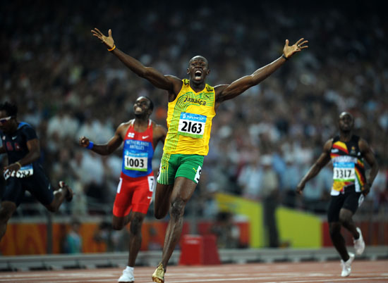 盡管在今年5月曾經打破男子百米世界紀錄,但博爾特真正被世界認知,并且登堂入室成為體壇巨星,是在北京奧運會。他在雅典奧運會時僅獲200米第五名,去年田徑世錦賽也只獲兩項亞軍。然而,這個身高1米96的“大鳥”,在“鳥巢”連續獲得男子100米、200米、4X100米冠軍,并刷新這三個項目的世界紀錄。尤其是在100米決賽中,他放棄沖刺,跳舞一般就跑出了9秒69,而200米世界紀錄已保持了12年之久。從來沒有任何人在一屆奧運會上獨拿3枚短跑金牌并全部打破世界紀錄,其成就絕對是前無古人。