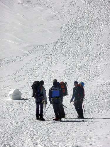 8月24日,在法國東部沙莫尼山谷勃朗峰法國一側的海拔3800米處,救援人員搜救雪崩事故的失蹤者。歐洲最高峰勃朗峰當天凌晨發生雪崩,目前造成至少8人受傷,10人下落不明。 新華社/法新