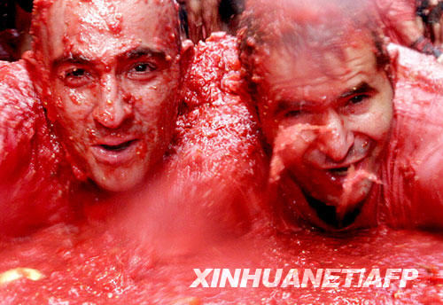 8月27日,在西班牙首都馬德里以西300公里的布尼奧爾,兩名男子在傳統節日“番茄大戰”活動中倒在番茄汁中。每年,都會有數萬名來自世界各地的游客來到布尼奧爾參加“番茄大戰”。人們互擲番茄,體會這項活動帶來的樂趣。 新華社/法新