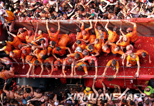 8月27日,在西班牙首都馬德里以西300公里的布尼奧爾,人們在傳統節日“番茄大戰”活動中互擲番茄。新華社/法新