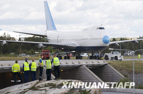 8月28日,在瑞典首都斯德哥爾摩阿蘭達機場,一架波音747-200飛機正在被牽引到停泊點。新華社/法新