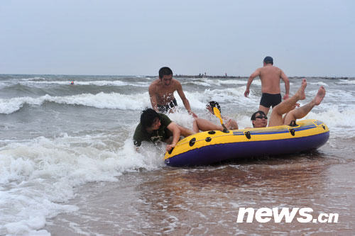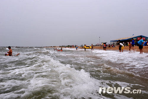 8月31日,遼寧省葫蘆島市洪家海灣,游人在海水中玩耍。