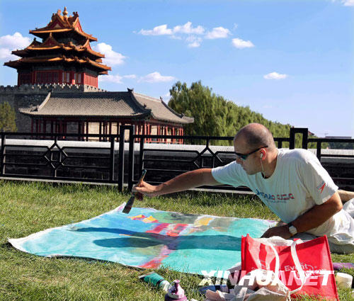 8月31日,北京秋高氣爽,前來參加殘奧會的必和必拓殘奧大使、美國人格里高利·伯恩斯坐在北京故宮角樓旁的草地上用畫筆描繪古都北京。