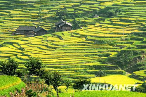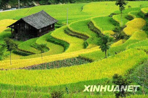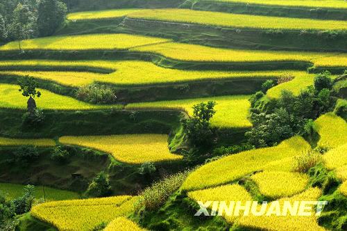 9月7日拍攝的都勻市基場水族鄉稻谷豐收的景象。貴州省都勻市基場水族鄉今年風調雨順,稻谷長勢喜人,隨著金秋時節的到來,梯田里的稻谷已開始成熟,呈現出一派豐收的美麗景象。