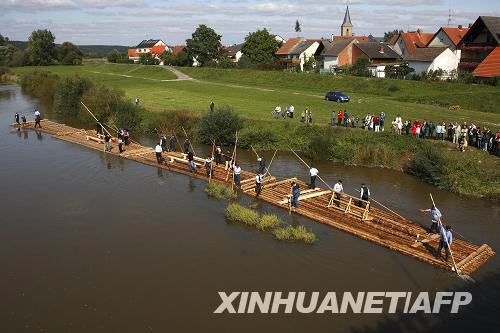 9月14日,當地人們駕駛著一條75米長的巨型木筏航行在德國南部的美因河上。這條木筏是按照50年前在美因河上航行的木筏的樣式仿制的。新華社/法新
