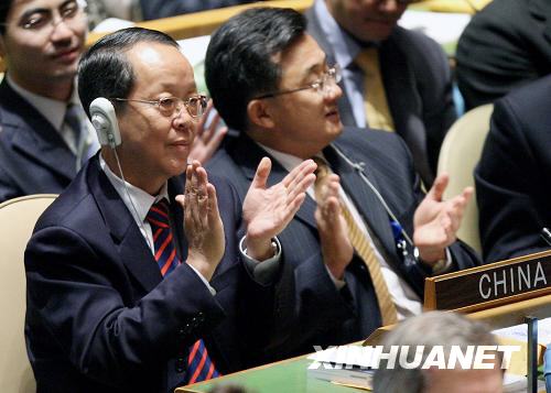 9月16日,在美國紐約聯合國總部,中國常駐聯合國代表王光亞(前左)在第63屆聯大第一次全會上鼓掌。