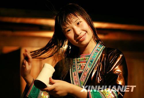 9月23日,在廣西融水苗族自治縣桿洞鄉黨鳩苗寨,一位苗族姑娘用電吹風吹干頭發。國慶前夕,位于黔桂交界處大苗山深處的廣西融水縣桿洞鄉黨鳩苗寨用上了電網電。桿洞鄉位于大苗山深處摩天嶺山脈,此前主要靠山村小水電供電。