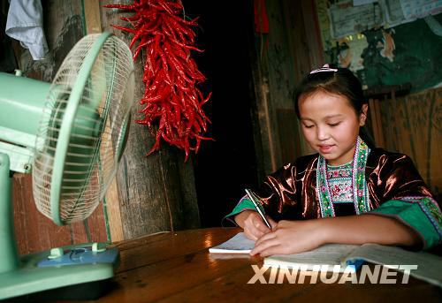 9月23日,在廣西融水苗族自治縣桿洞鄉黨鳩苗寨,一位苗族小女孩在電風扇旁溫習功課。國慶前夕,位于黔桂交界處大苗山深處的廣西融水縣桿洞鄉黨鳩苗寨用上了電網電。桿洞鄉位于大苗山深處摩天嶺山脈,此前主要靠山村小水電供電。