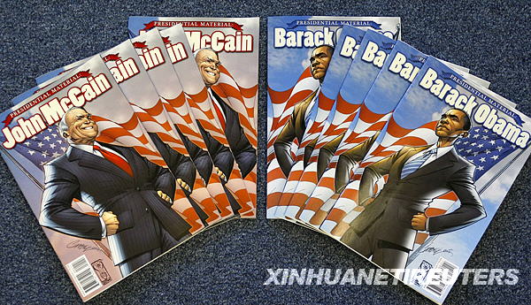 這張2008年10月6日在美國圣迭戈一家出版商辦公室內拍攝的照片展示即將出版的美國民主黨總統候選人奧巴馬(右)和共和黨總統候選人麥凱恩(左)的漫畫傳記。奧巴馬和麥凱恩的漫畫傳記將于10月8日出版,出版商希望它們能受到成年人的青睞。新華社/路透