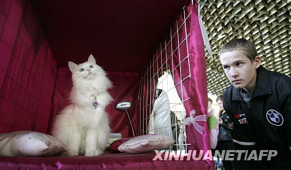 10月12日,在吉爾吉斯斯坦首都比什凱克,一名男孩觀看貓展上展出的貓。新華社/法新