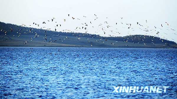 深秋時節,數以千計的水鳥聚集在黑龍江省密山市青年水庫,在秋日暖陽下,鳥兒在水中嬉戲、覓食。