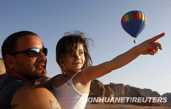 10月16日,在以色列的埃拉特市,一名小游客和父親共同觀看放飛的熱氣球。據悉,此次為期一周的熱氣球節是為慶祝猶太教傳統節日“住棚節”的到來而舉辦的。新華社/路透