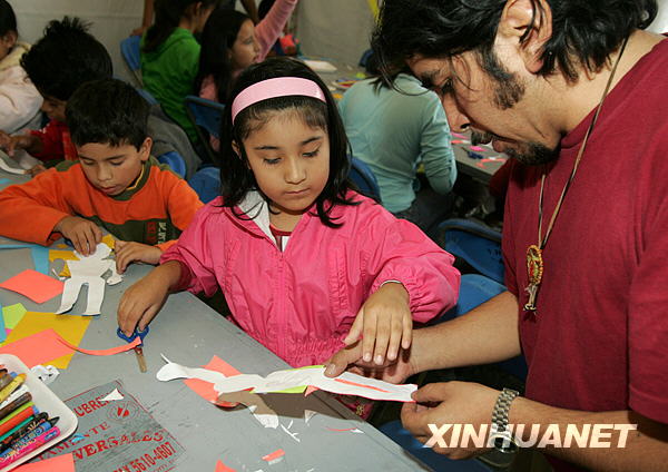 10月18日,在墨西哥城舉辦的墨西哥第八屆圖書節上,輔導老師(右)指導孩子們練習剪紙。