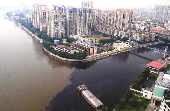 污水侵入珠江 半個江面變黑