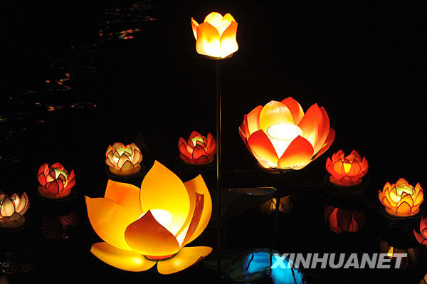 10月27日,普陀山普濟寺前一處蓮花造型的彩燈。