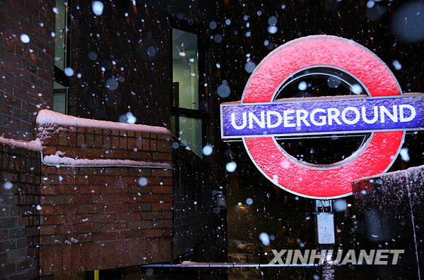 10月28日夜,英國首都倫敦一個地鐵標志牌被雪覆蓋。