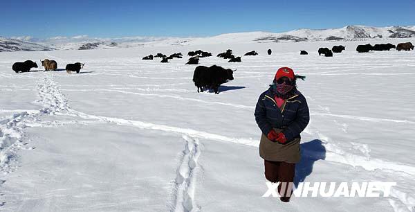 10月30日,西藏隆子縣日當鎮牧民洛桑卓瑪在雪地里尋找失散的牦牛。