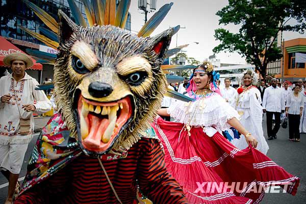 11月3日,在巴拿馬首都巴拿馬城,身著傳統服裝的民眾參加國慶節慶祝游行。
