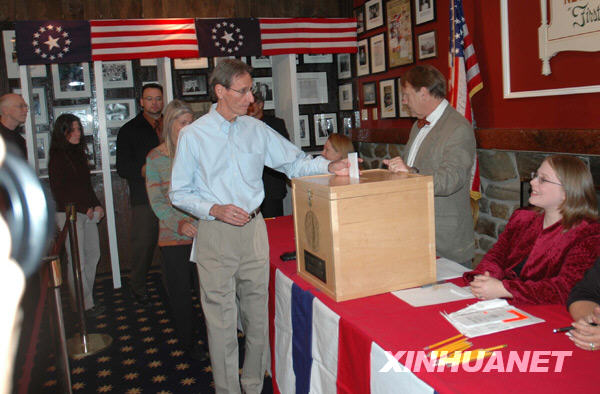 11月4日,在美國新罕布什爾州北部的迪克斯維爾山口小鎮,人們排隊投票。當地時間11月4日零點(北京時間4日13時)左右,新罕布什爾州兩個小鎮迪克斯維爾山口和哈特的選民率先開始投票,標志著4年一度的美國大選投票正式開始。