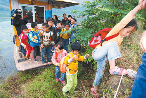 2008年11月5日,三峽重慶庫區云陽縣養鹿小學的學生乘坐“學生免費渡”回家。三峽工程175米高程試驗性蓄水以來,庫區河面增寬,河汊增多,群眾出行不便。當地政府及時增添義渡,優化航線,免費接送學生上下學,并安排安監人員護送。目前,僅云陽縣就有義渡船70多只。