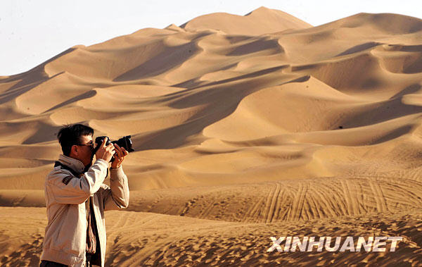 游客在沙山公園內拍照(11月8日攝)。位于新疆維吾爾自治區鄯善老城南端的沙山公園占地面積超過1800平方公里,是國內占地面積最大的沙漠公園。秋日的沙山公園金色大漠雄渾壯觀,公園內的沙山、沙漠風沙地貌吸引不少游客前來參觀游覽。