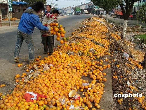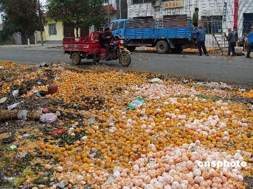2008年11月10日,湖北宜昌市夷陵區鴉鵲嶺鎮,被當成垃圾傾倒在路邊的柑橘隨處可見。據悉,受四川廣元“蛆柑”事件影響,沒有出現疫情的湖北省柑橘外銷曾一度全面停滯,經有關有關部門“救市”后,目前銷售量已恢復到正常水平的85%,但柑橘收購價較往年暴跌,而且收購商對柑橘的大小、品相等要求嚴格,導致大量“等外品”柑橘被當成垃圾倒掉,經濟損失慘重,成為橘農們的錐心之痛。