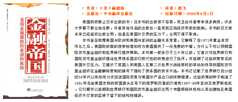 邁克爾·赫德森的這本輝煌的具有毀滅性沖擊力的著作將引起正統經濟學家深深的不安和憤怒的反擊。古典經濟學家不喜歡人們提起帝國主義的丑陋現實。赫德森是當前世界上少數幾位用令人吃驚的角度看待老問題的經濟思想家。