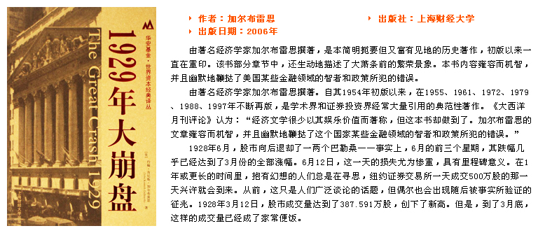 由著名經濟學家加爾布雷思撰著,是本簡明扼要但又富有見地的歷史著作,初版以來一直在重印。該書部分章節中,還生動地描述了大蕭條前的繁榮景象。本書內容雍容而機智,并且幽默地鞭撻了美國某些金融領域的智者和政策所犯的錯誤。