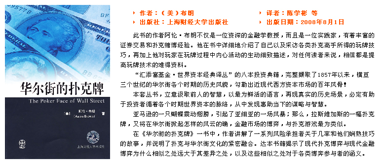 揣摸賭徒在賭桌上的心理 比自殺更安全 十分之五的門檻 在非理性的包圍中泰然處之 讓我們做筆交易 比峭壁、潮汐和星星更有耐性;如夜晚的黑暗一洋無盡和耐心 注釋參考目錄 撲克的歷史與涵義 賭博的歷史與涵義 金融與賭博 特別資料 |