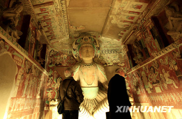 11月18日,參觀者在法國巴黎的中國文化中心觀看立體復制的敦煌莫高窟第275號石窟。當天,由中國甘肅省敦煌市人民政府、巴黎中國文化中心和吉美博物館聯合舉辦的“敦煌花雨”藝術展在巴黎舉行媒體預展。該展覽將于11月21日正式向公眾開放,并持續至2009年2月28日。