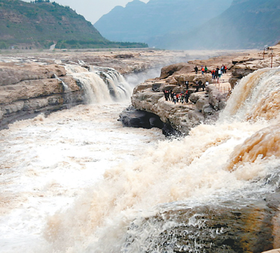 11月19日,黃河壺口迎來冬汛,壺口瀑布氣勢磅礴,景象壯觀。雖已進入11月旅游淡季,觀賞瀑布的游客卻絡繹不絕。圖為游客在黃河壺口瀑布景區游覽。