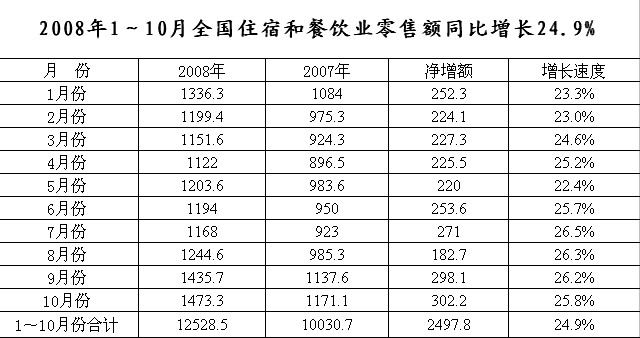 10月份,全國住宿與餐飲業繼續保持快速增長,零售額實現1473.3億元,同比增長25.8%,環比增長2.6%,比上年同期加快4.4個百分點。