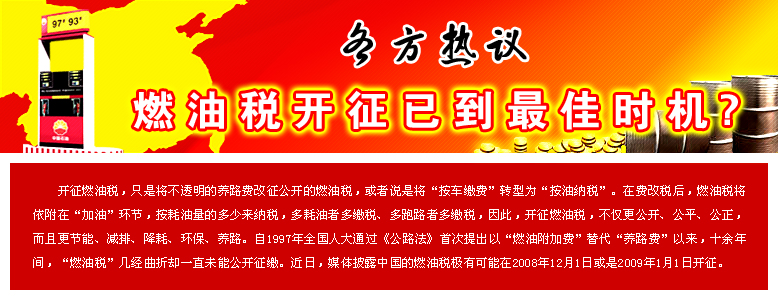 12月1日正式開征的可能性比較大。您認為12月1日開征的時機是不是太倉促了嗎? 何振一:從當年提出燃油稅到現在已經有10年之久。在最初提出來以后,正趕上國際油價一路攀升,于是政府就想等油價降下來再開征,如今國際油價持續下降,正是開征的好時機。 開征燃油稅有利于拉動內需,中國石油價格由政府管控,政府也希望能夠做出相應價格改革。開征燃油稅的初衷,并不是為了增加開車人負擔,政府的意思是相反。 和訊網:全球金融危機、經濟疲軟、油價持續回落,為燃油稅的開征創造了一個有利的時機。但是在全球油價最近急速下降的時候,國內的油價并沒有下跌,目前國內的油價其實處于最高點,為什么在這個時候開征呢? 何振一:其實開征燃油稅就是想利用時機降低石油價格。征了燃油稅以后這樣今后國家不會很嚴格的干預石油價格,而與國際接軌,根據國際油價而上下浮動。[詳情] | | |