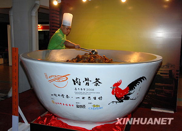 當天在此舉行的2008肉骨茶嘉年華會上,馬來西亞中華工商聯合會所屬巴生市中華總商會推出世界最大碗肉骨茶。這碗肉骨茶由當地5家肉骨茶店用500公斤豬肉、450公升肉骨茶湯和50公斤藥材制成,碗口直徑182.88厘米,高91.44厘米,已被列入馬來西亞記錄大全,并將申報世界吉尼斯紀錄。 |