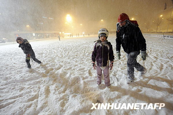 11月23日,在芬蘭首都赫爾辛基,人們在雪后的溜冰場玩耍。近日,歐洲部分地區遭遇了今冬的首場暴風雪。新華社/法新