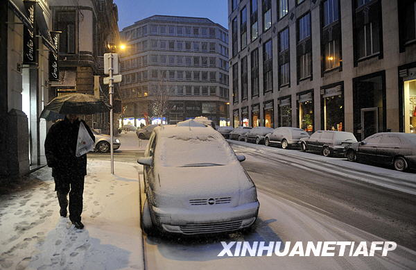 11月23日,在比利時首都布魯塞爾,一名男子走過雪后的街道。新華社/法新