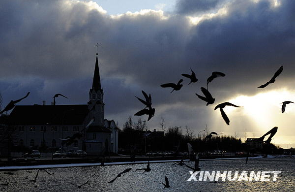 圖為11月17日拍攝的雷克雅未克市政廳前湖面飛起成群水鳥。 |