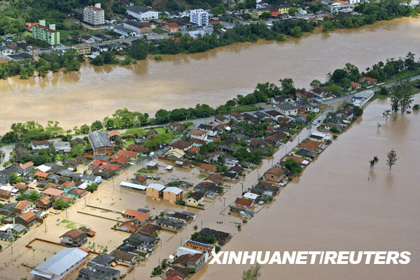 11月24日,巴西圣卡塔琳娜州伊爾霍塔的大片房屋被洪水淹沒。連日暴雨在巴西南部引發洪災,造成至少59人死亡,4萬多人被迫撤離,圣卡塔琳娜州宣布進入緊急狀態。新華社/路透