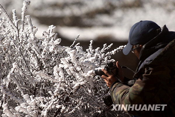 一位攝影愛好者在拉薩市墨竹工卡縣“日多”溫泉附近山林拍攝霧凇景觀(11月29日攝)。近日,西藏拉薩市墨竹工卡縣“日多”溫泉附近山林出現霧凇景觀,整片山林呈現出玉樹瓊枝的美麗景象。