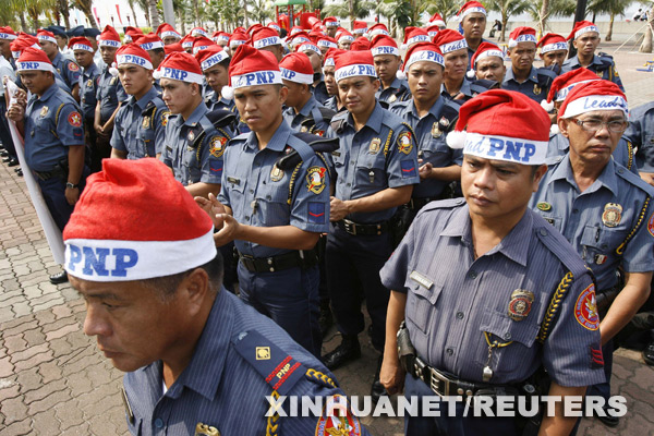 12月2日,在菲律賓馬尼拉,菲律賓警察頭戴圣誕老人的帽子參加“圣誕老人警察2008”活動啟動儀式。這項活動當天啟動后,大約200名菲律賓警察將開始頭戴圣誕老人的帽子在商場等人流量大的地區執勤,以使他們在圣誕節期間的巡邏能更加醒目,從而更加有效地防范犯罪活動。新華社/路透