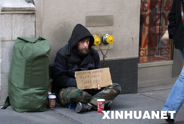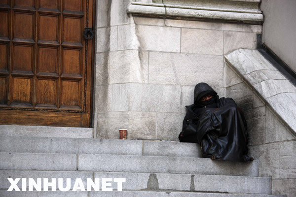 12月5日,美國勞工部公布的數據顯示,今年11月份美國非農業部門就業崗位減少53.3萬個,為1974年12月份以來的最大減幅,失業率上升到6.7%,為15年來的最高點。這是11月11日,一名流浪漢在美國紐約曼哈頓街頭乞討。