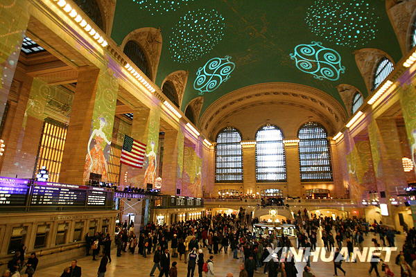 12月5日,在美國紐約的大中央車站,圣誕萬花筒燈光秀映射在車站大廳的穹頂和墻壁上。
