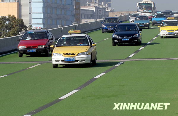 12月9日,車輛在武漢卓刀泉高架橋的綠色“跑道”上行駛。當日,湖北省武漢市卓刀泉高架橋通車。這條高架橋為武漢市首條彩色路面高架橋,路面采用了彩色陶瓷顆粒新型材料,具有防滑、耐磨、耐腐等特點。新華社發