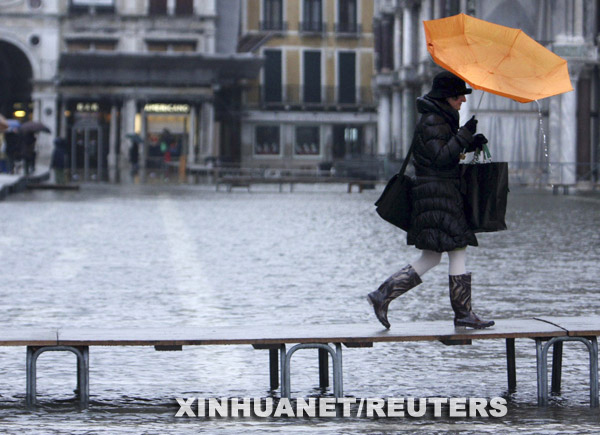 12月10日,在意大利“水城”威尼斯,一名行人使用臨時搭建的通道穿過被洪水淹沒的廣場。 威尼斯本月遭受20年未見的大洪水侵襲,全城98%陸地被淹沒。為挽救旅游市場,威尼斯旅館業推出“威尼斯高水位”旅游促銷計劃,把洪水包裝成旅游賣點,為游客免費提供橡膠長靴、高水位步行路線圖及住宿費打折等服務。 新華社/路透