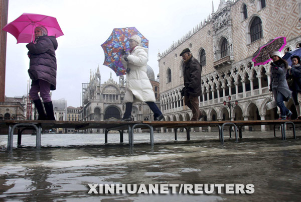 12月10日,在意大利“水城”威尼斯,行人使用臨時搭建的通道穿過被洪水淹沒的廣場。新華社/路透
