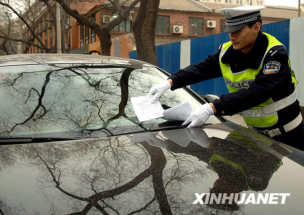 12月10日,北京東城交警支隊的干警在亂停放的車輛上擺放提示單。近日,北京開始集中整治亂停車,把城區主要大街、環線道路、交通樞紐地區、繁華商業網點以及遠郊區縣的中心城區道路等處作為重點整治地段,以緩解因違法停車而導致的交通擁堵。